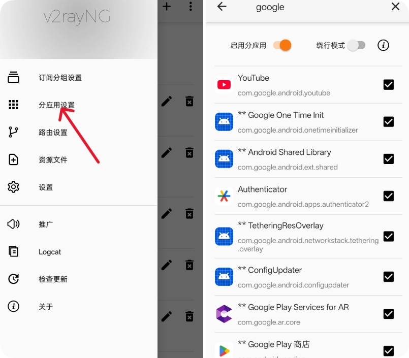 搜索google可以将google系的所有软件筛选出来打勾,则google系的所有软件均经过代理节点。可以明显减少电池消耗。