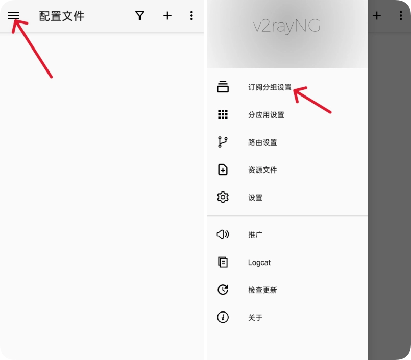安装并打开软件,点击左上角汉堡菜单,选择订阅分组设置