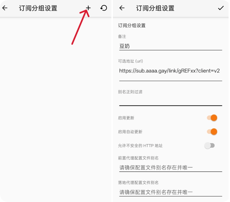 点击+号,随便填写备注名,将第一步复制的订阅地址填入地址栏,勾选下方启用自动更新,之后点击右上角√号保存