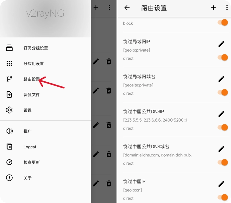 V2rayNG不提供分流模板,分流不是刚需的用户使用比较方便。需要更加详细的预配置分流规则,推荐使用Clash Meta for Android。
