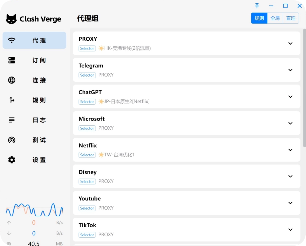 左侧边栏选择代理,右侧可以选择需要使用的节点,最上方有三种模式,一般使用全局或规则模式,全局模式下所有节点均会走代理,规则模式下可以为设置不同网站所经过的代理