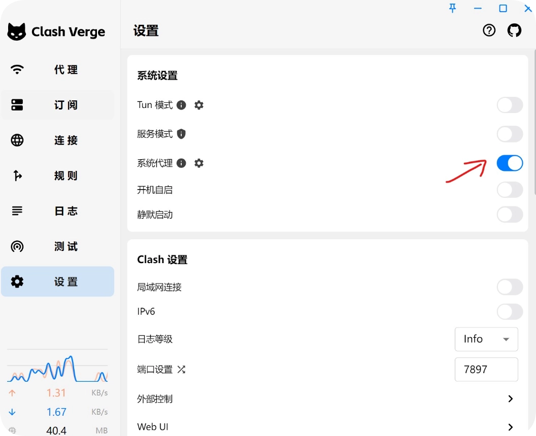 节点启用后,还需要配置系统代理才能让其他软件(例如浏览器)开始使用代理。在右下角系统托盘找到应用图标