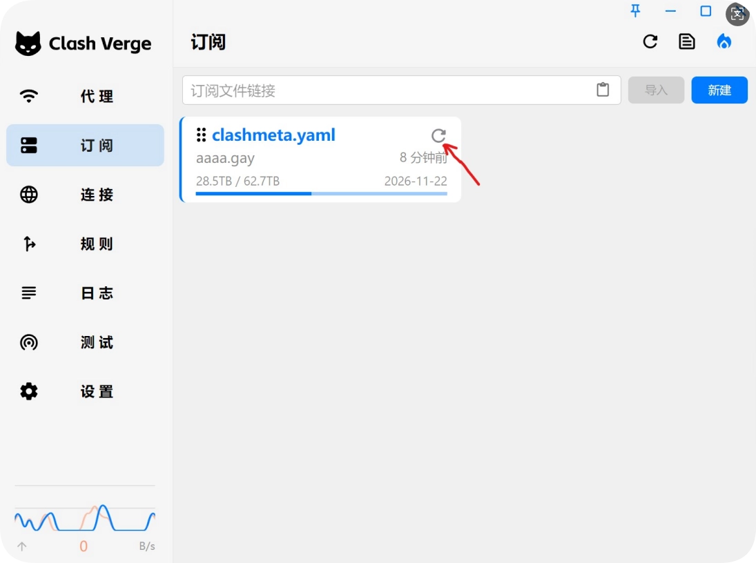 在Clash Verge左侧边栏选择订阅,在文本框内粘贴第一步复制的订阅链接,之后点击右侧的导入按钮,稍等会提示导入成功同时底部出现一个新的yaml配置,选择这个配置