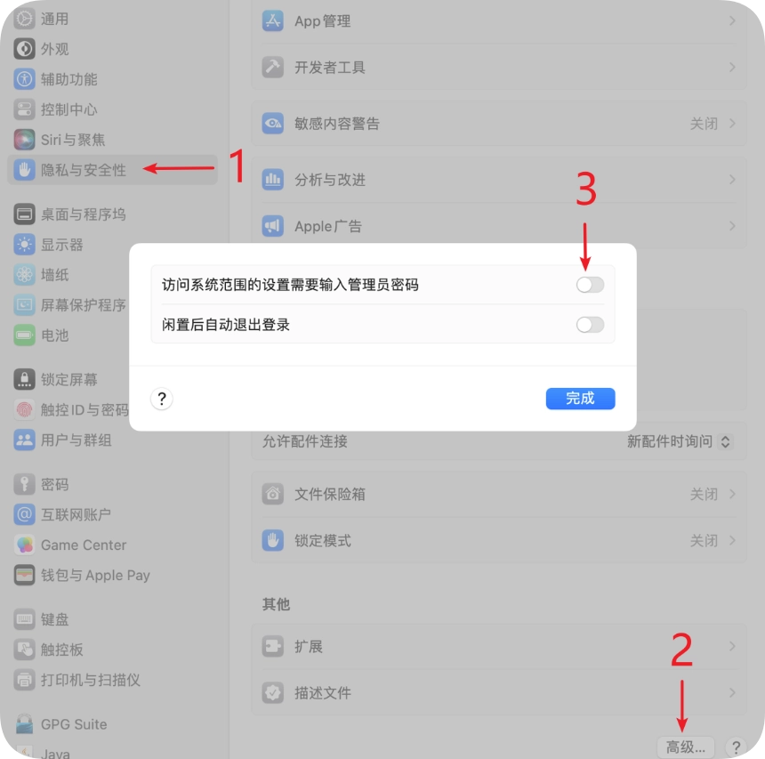 解决方案:系统偏好设置 -> 安全性与隐私 -> 高级,"关闭"访问系统范围偏好设置需要输入管理员密码"(不同系统版本的名称略有差异),点击"完成 -