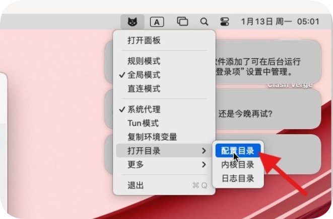 小猫咪图标->打开目录->配置目录,"关闭" 将目录文件全部删除,然后卸载Clash Verge,重新安装即可。 -