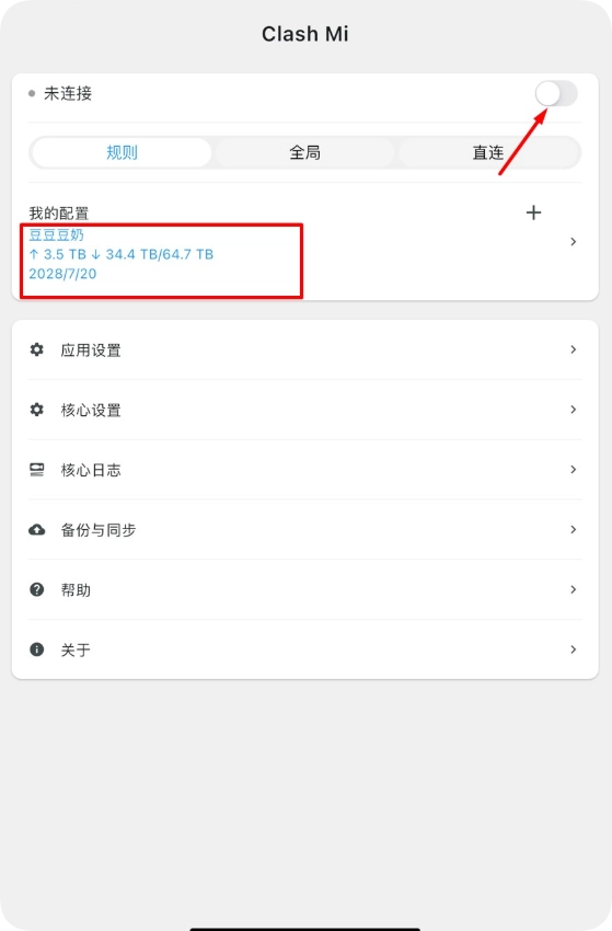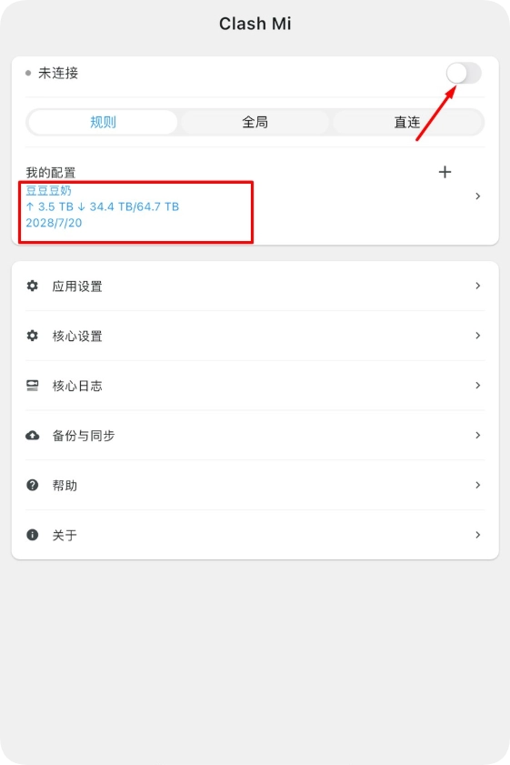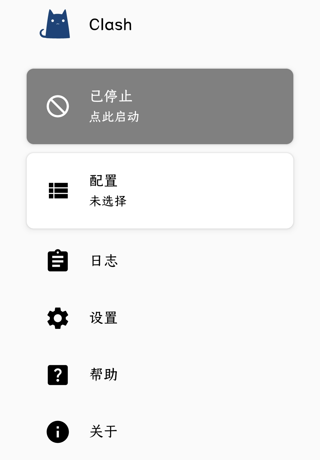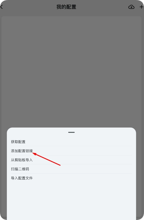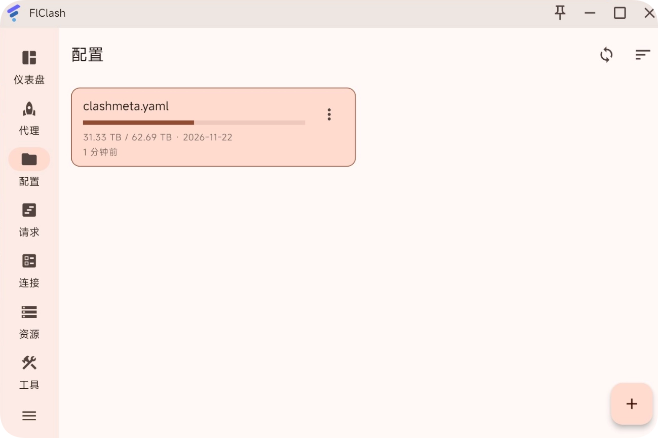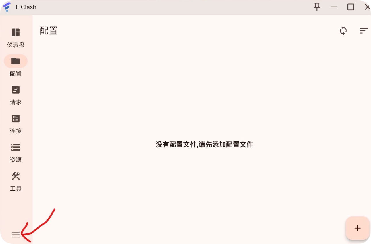 打开安装好的Clash Mi软件,点击我的配置一栏的+号