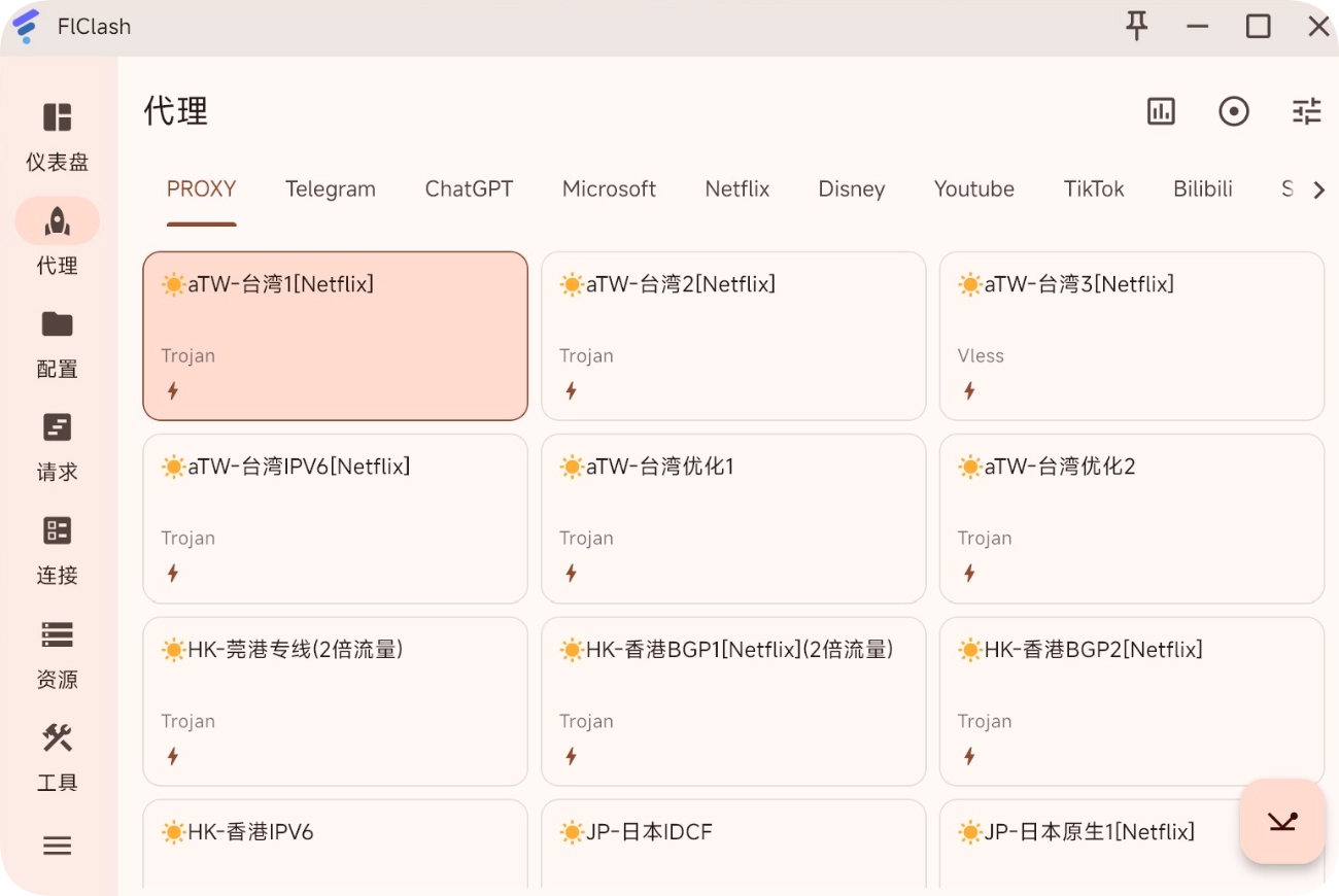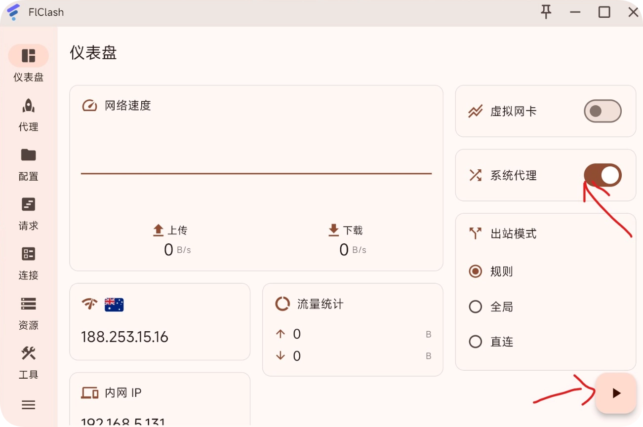 仪表盘内在不打开虚拟网卡的情况下,默认仅浏览器会使用代理,如果需要其它桌面软件科学-上网,可以打开虚拟网卡,需要注意,虚拟网卡需要通过管理员权限打开FlClash软件才能使用。