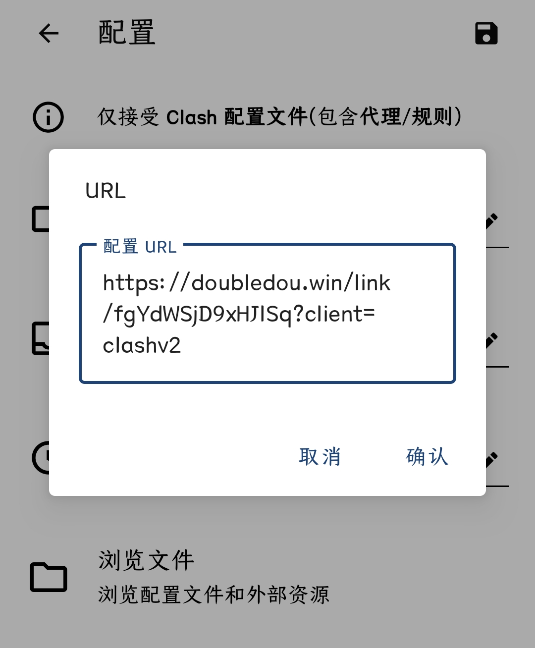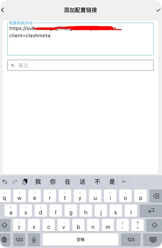 在底部选择添加配置链接,填写上一步复制的订阅链接,点击右上角√,添加成功后返回首页可以看到配置信息,点击右上角的开关将其打开