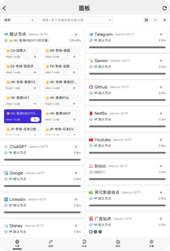 在面板中在不同的规则组中选择节点即可,注意第一个分组为默认的代理组,所有未被匹配的网站都会经过这个默认组代理