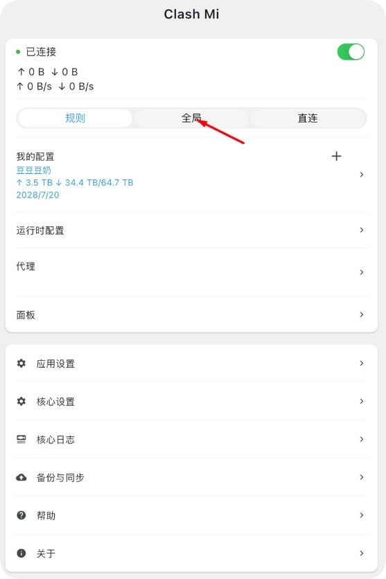 在开关打开状态,点击首页上方的全局按钮,切换到全局模式,然后点击面板