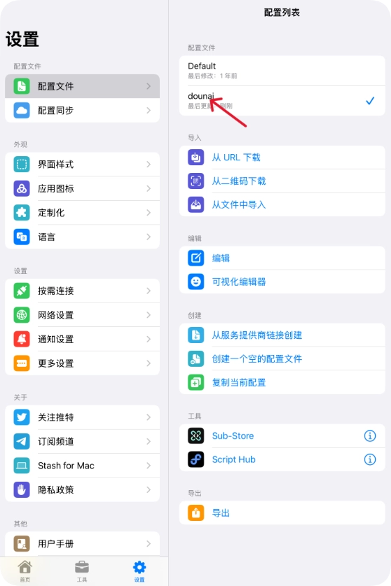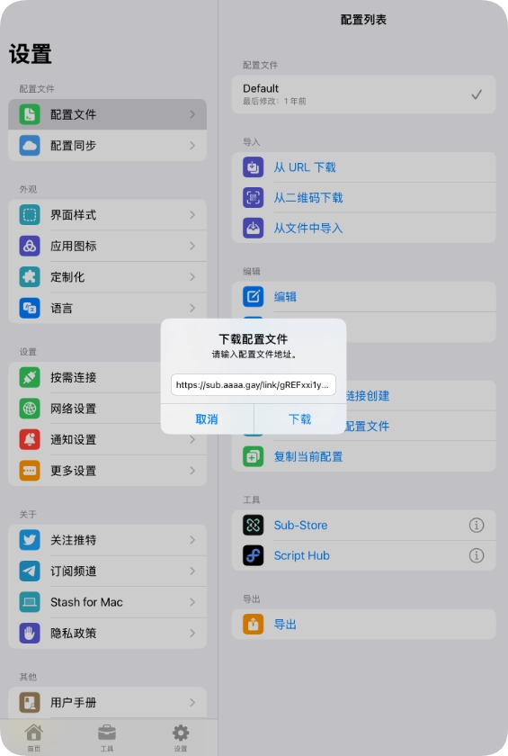 打开安装好的Stash软件,点击最下方的设置,选择配置文件-从URL下载。