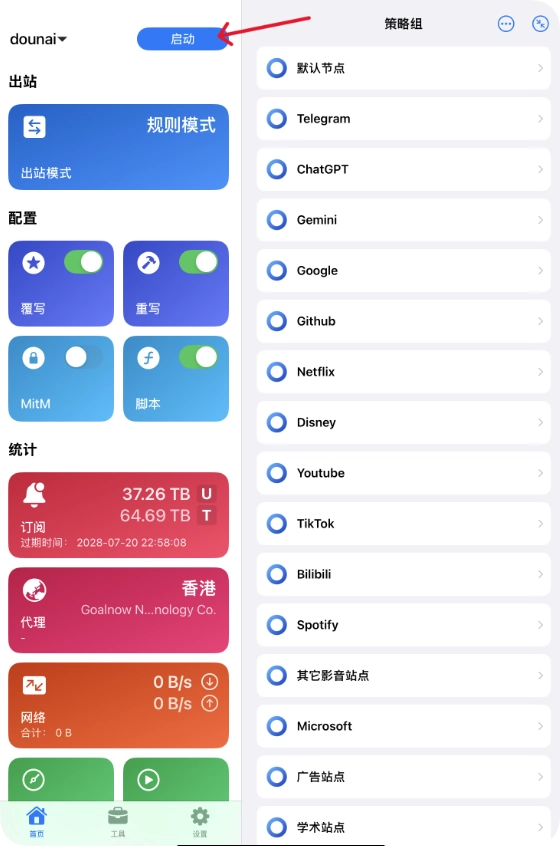 iPad可以再右侧策略组选择节点,默认节点是默认使用的科学上网节点,如需使不同网站使用不同节点