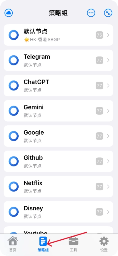 可以在对应网站名称下选择需要使用的节点。iPhone需要再软件最下方选择策略组,来配置节点