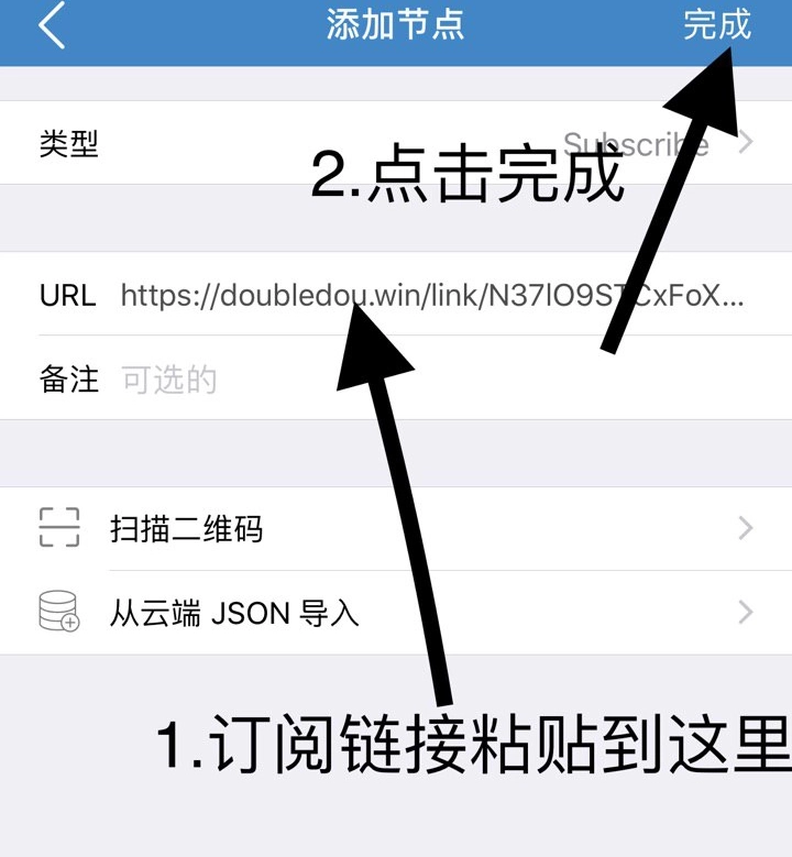 打开安装好的Shadowrocket软件,点击右上角+号,选择Subscribe,填写上一步复制的订阅链接,点击完成如无意外即可看到节点列表。