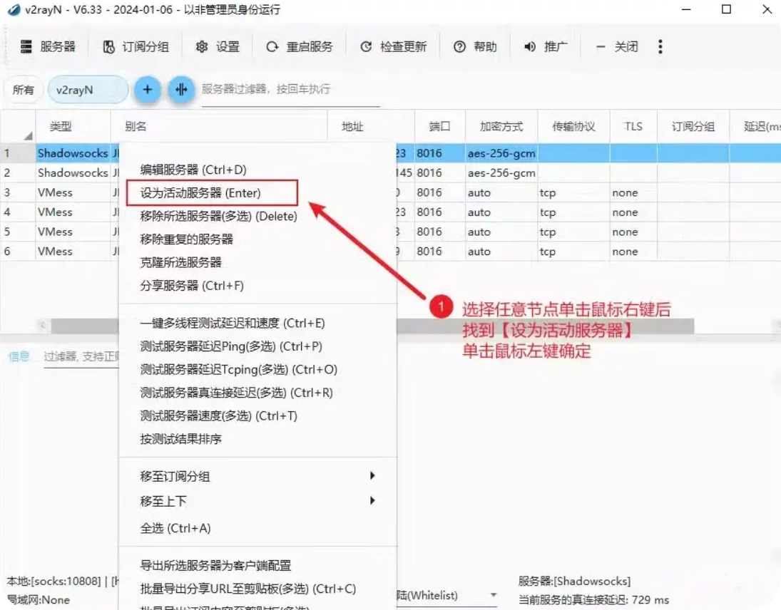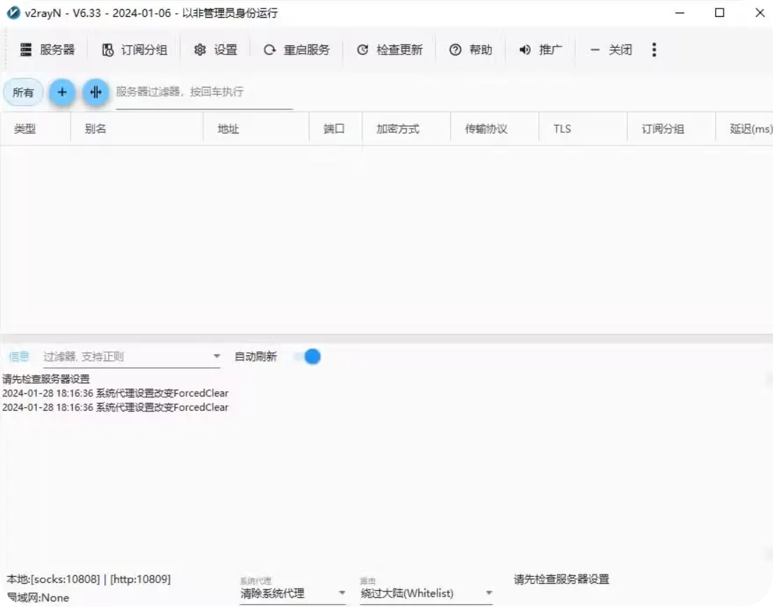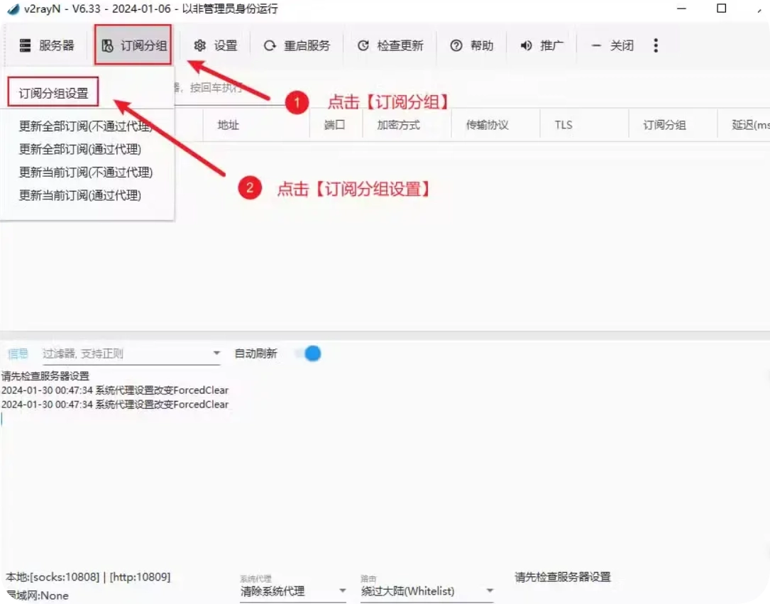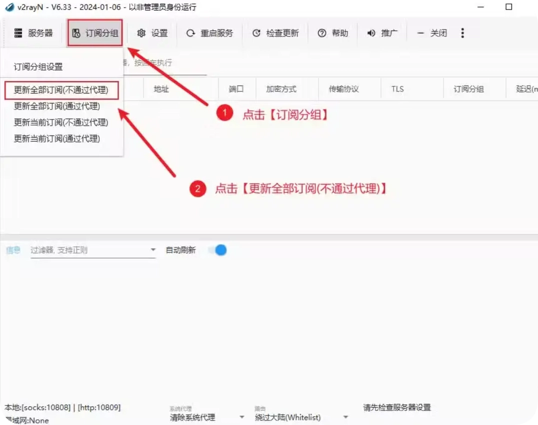 添加订阅后,首先要更新订阅信息,获取代理服务器节点。点击“订阅分组”->”更新全部订阅(不通过代理)”。首次更新选择“不通过代理”,后续的更新可以根据情况选择。