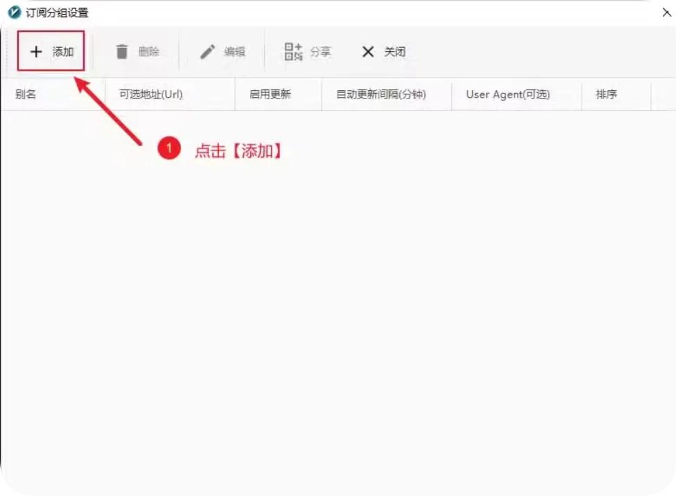 打开“订阅分组设置”后,点击左上角添加按钮进行添加